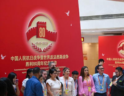 访问新闻中心,以纪念对日本战争战争80周年。 SCO国家博物馆文化事物展览在北京开幕